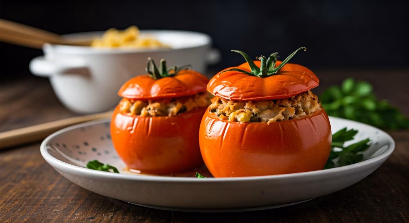 Chicken Stuffed Tomatoes are a hearty and healthy dish perfect for a satisfying meal. Ripe tomatoes are hollowed out and filled with a savory mixture of cooked chicken, vegetables, herbs, and often breadcrumbs or rice. Popular additions include onions, garlic, bell peppers, mushrooms, and cheese. The stuffing is seasoned with herbs like basil, oregano, and thyme for an aromatic flavor. The tomatoes are then baked until tender, allowing the flavors to meld together beautifully. This dish is not only delicious but also visually appealing, making it a great option for entertaining guests.