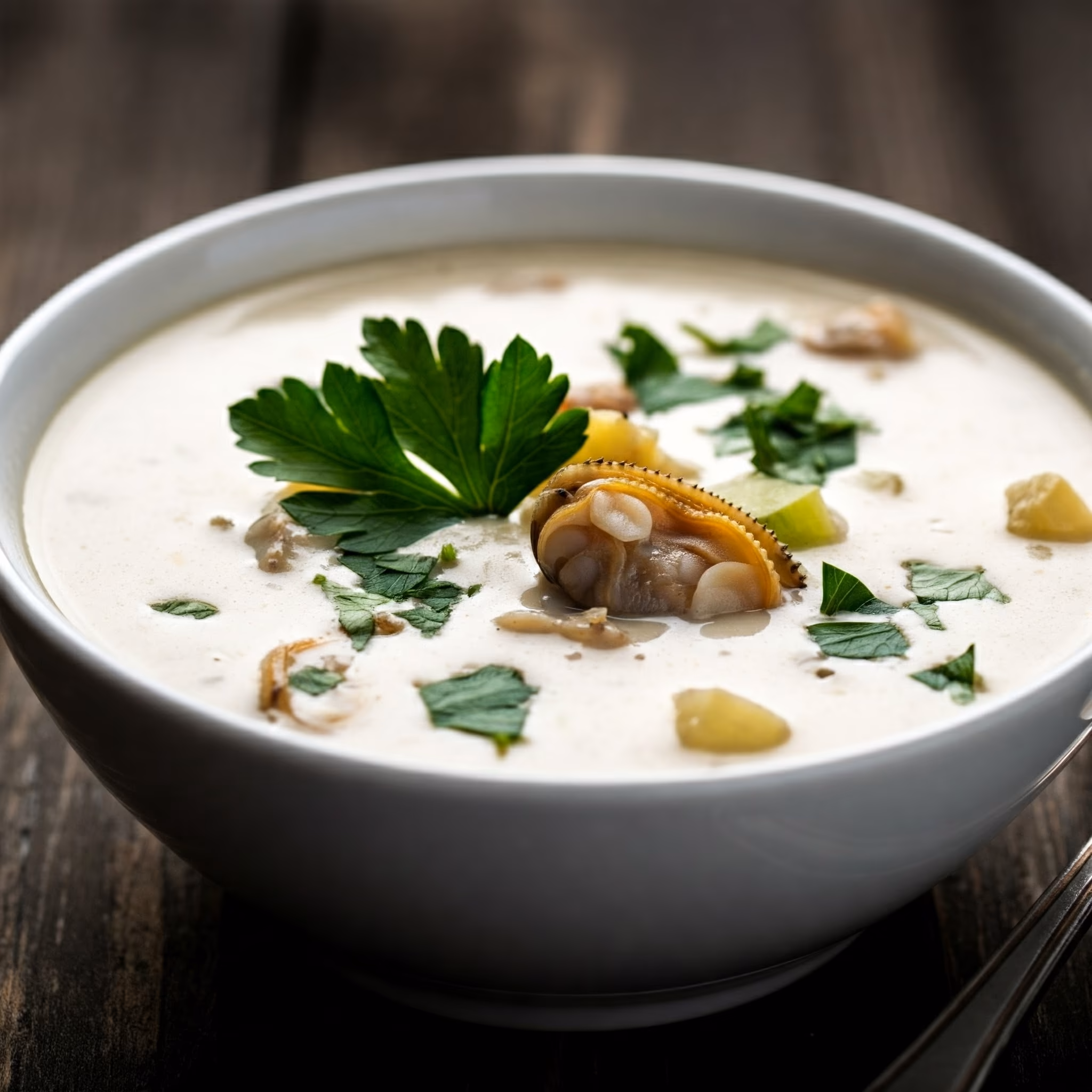 Clam Chowder is a creamy and comforting soup that's a classic of New England cuisine. This hearty chowder features tender clams simmered in a rich broth with potatoes, onions, and often bacon or salt pork. The addition of milk or cream creates a velvety smooth texture, while a touch of butter adds richness. Seasoned with herbs and spices like thyme, bay leaf, and black pepper, Clam Chowder offers a delightful balance of flavors. Whether enjoyed on a chilly day, by the seaside, or as a comforting meal, Clam Chowder is a delicious and satisfying dish that evokes a sense of warmth and nostalgia.