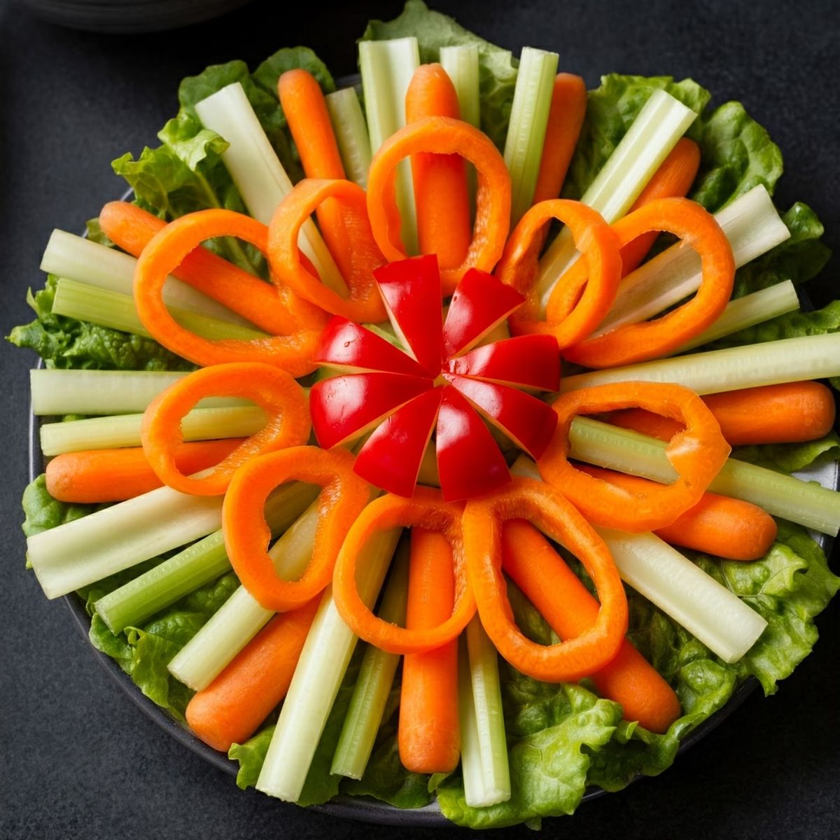 Flower Salad is a creative and visually stunning dish that transforms simple ingredients into a delightful garden of edible blooms. The salad features crisp celery stalks as the stems, vibrant red bell pepper petals, and fresh, crunchy carrots cut into flower shapes, all arranged on a bed of tender lettuce leaves. This playful presentation not only makes for an eye-catching centerpiece but also offers a light, refreshing mix of flavors and textures. The combination of sweetness from the bell peppers, earthiness from the carrots, and crunch from the celery creates a harmonious balance in every bite. Perfect for springtime gatherings, picnics, or as a fun addition to any meal, Flower Salad is a fresh and healthy way to brighten up your plate.