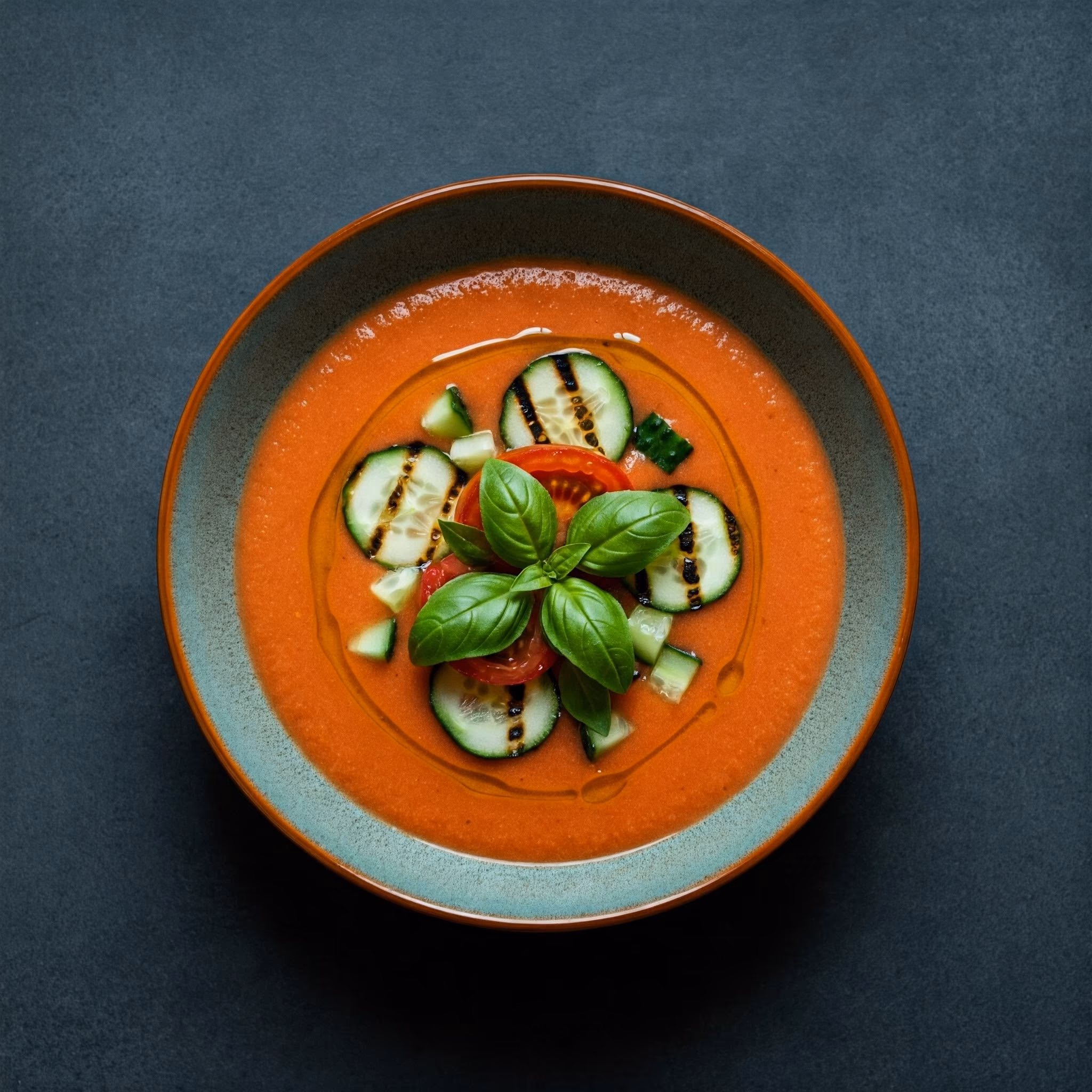 Grilled Tomato Gazpacho with Cucumber and Basil is a refreshing and flavorful twist on the classic chilled Spanish soup. This vibrant dish features ripe tomatoes grilled to perfection, enhancing their natural sweetness and adding a smoky depth. The grilled tomatoes are then blended with crisp cucumbers, fragrant basil, and other traditional gazpacho ingredients like onions, garlic, and peppers, creating a harmonious balance of flavors. This chilled soup is not only delicious but also healthy and hydrating, perfect for warm summer days or as a light and refreshing starter.