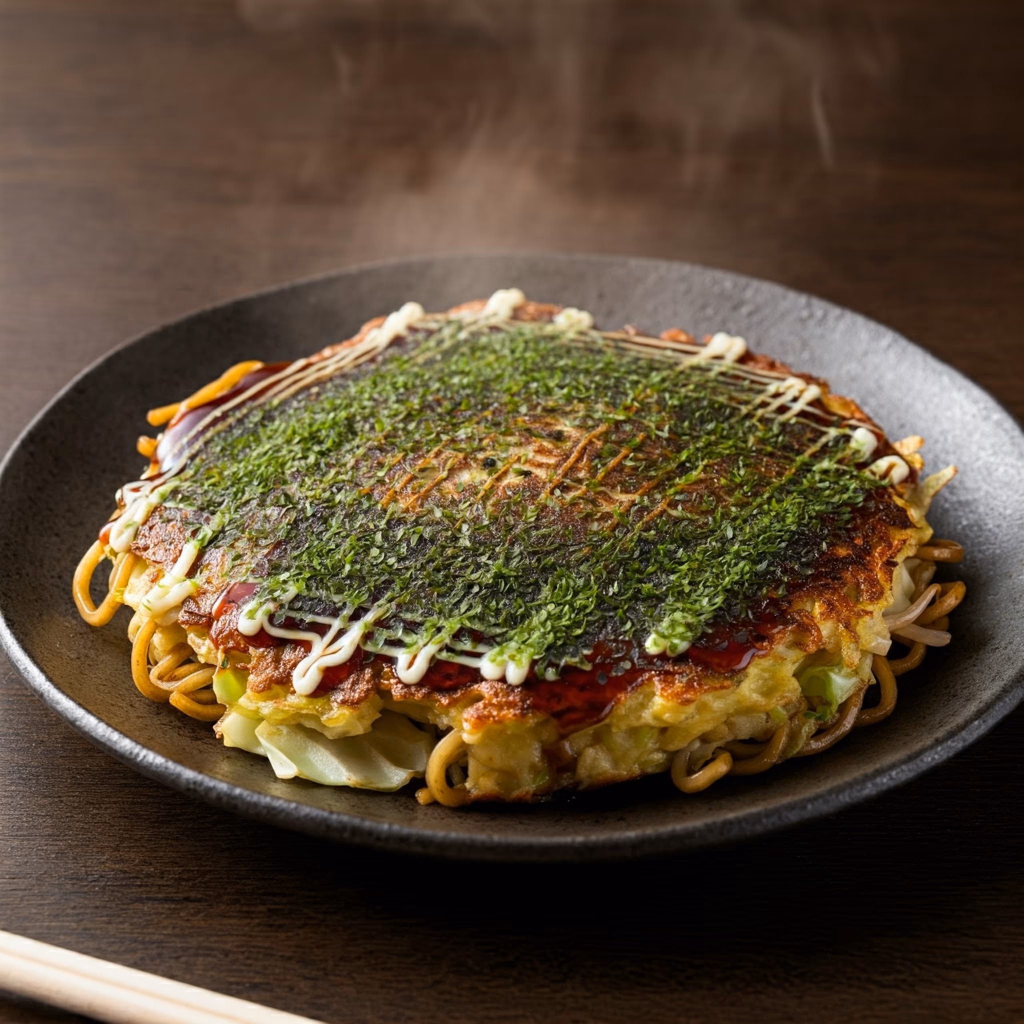 Okonomiyaki is a savory Japanese pancake that is a popular street food and home-cooked meal. The name means "grilled as you like it," reflecting the customizable nature of this dish. It typically consists of a batter made with flour, eggs, and shredded cabbage, cooked on a griddle and topped with a variety of ingredients, such as meat, seafood, vegetables, and sauces.