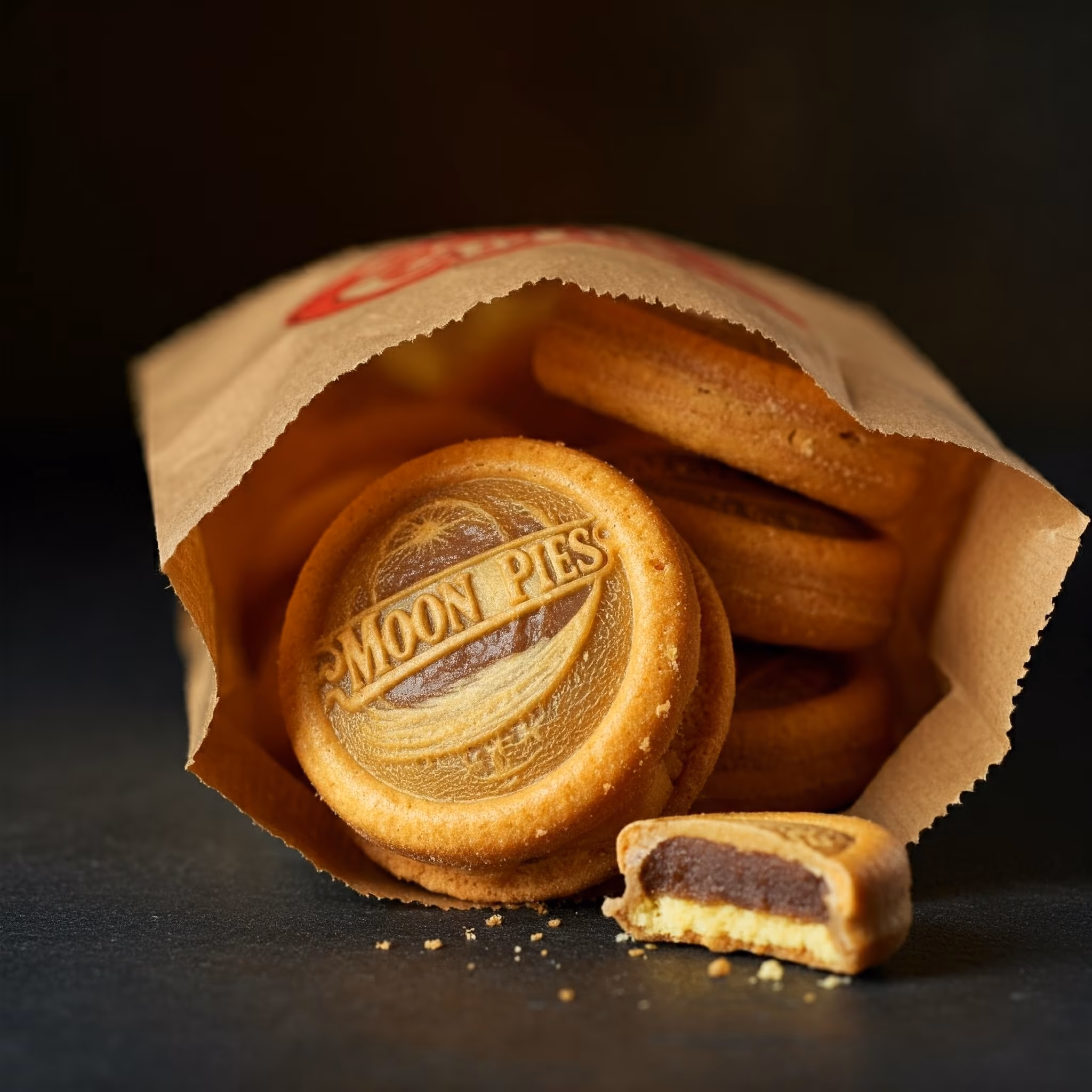 Moon Pies are a classic Southern treat consisting of two soft chocolate-flavored graham cracker cookies sandwiching a marshmallow filling, all coated in a thin layer of chocolate. They are known for their simple yet satisfying combination of flavors and textures, with the slightly sweet cookies contrasting with the fluffy marshmallow center and the chocolatey coating adding a touch of richness. Moon Pies are often enjoyed with an RC Cola, a pairing that has become a Southern tradition.