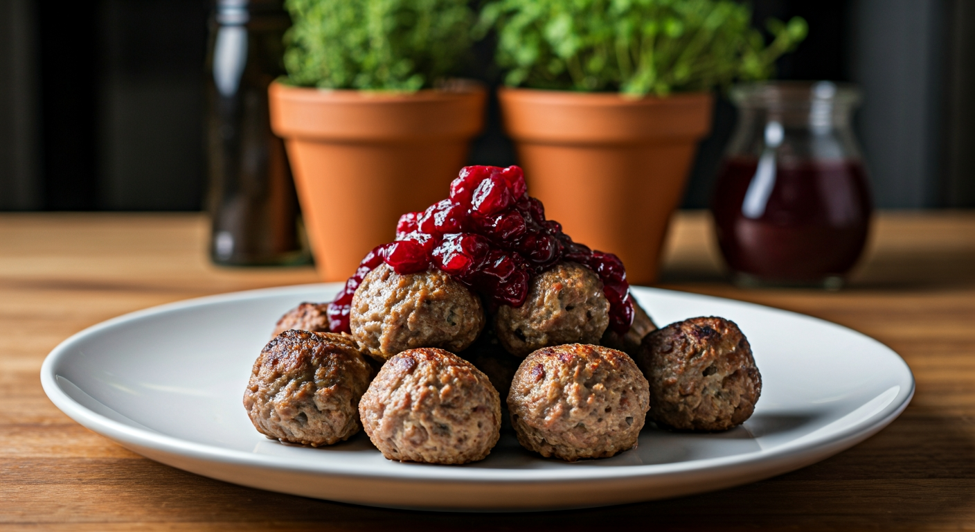 Deliciously seasoned meatballs served with a sweet and tangy lingonberry sauce, perfect for a traditional Norwegian dinner.