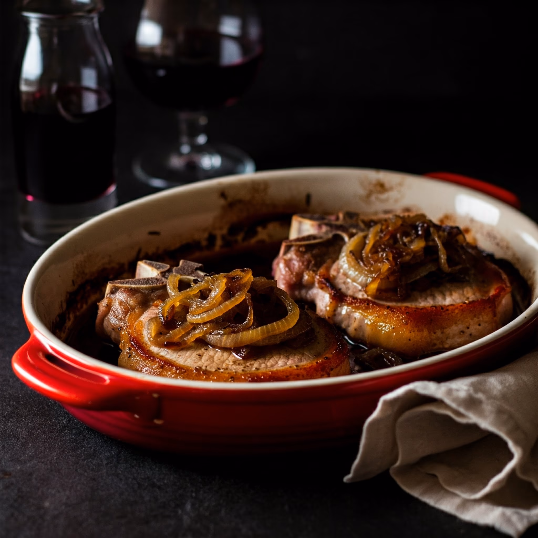 Pork Chops Baked with Wine is a savory, flavorful dish that features tender pork chops slow-baked in a rich, aromatic wine-based sauce. The pork chops are first seared to golden perfection, locking in their juices, before being bathed in a mixture of dry white wine, garlic, onions, and herbs like thyme and rosemary. As they bake, the wine reduces to create a luscious, savory sauce that complements the meat, infusing it with deep, robust flavors. The result is a melt-in-your-mouth pork chop with a subtle, yet elegant taste, making this dish perfect for a cozy dinner or a special occasion. Serve it with mashed potatoes or roasted vegetables for a complete, comforting meal.