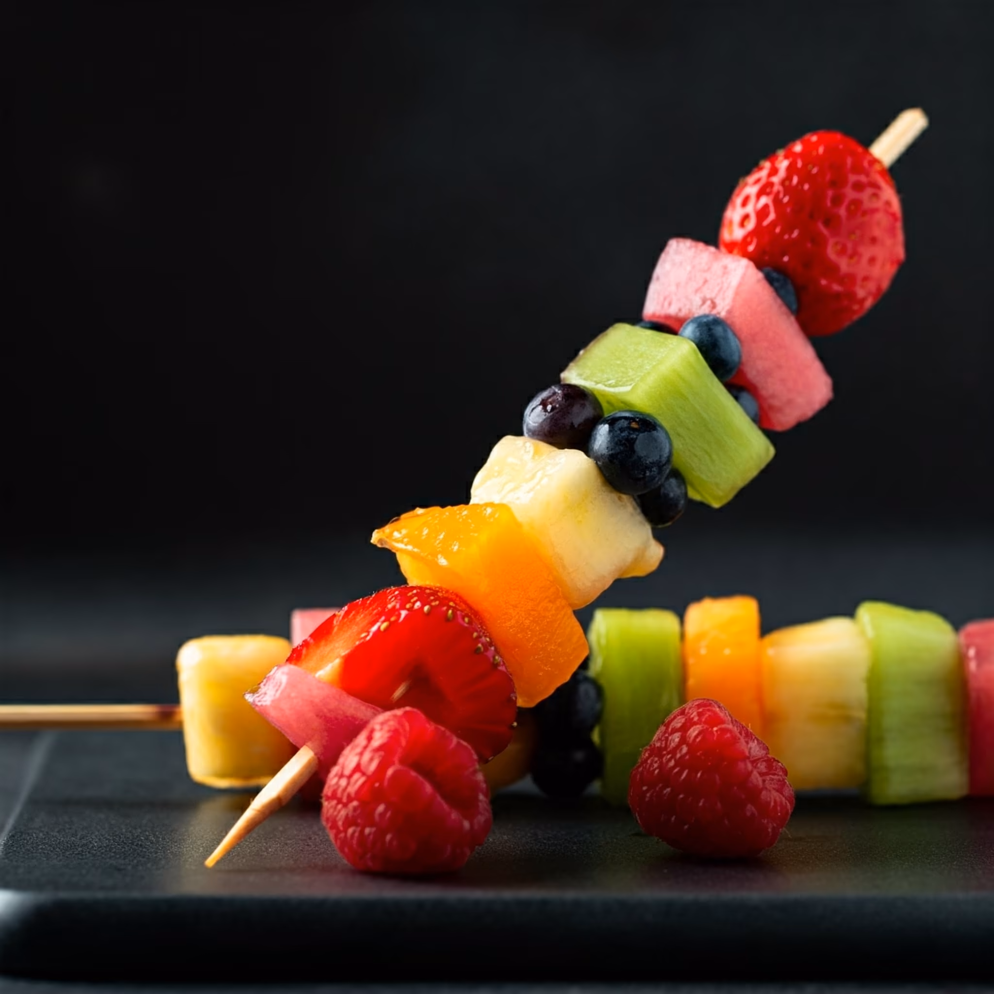 - Thread the fruits onto the wooden skewers in a colorful pattern, alternating between the fruits.