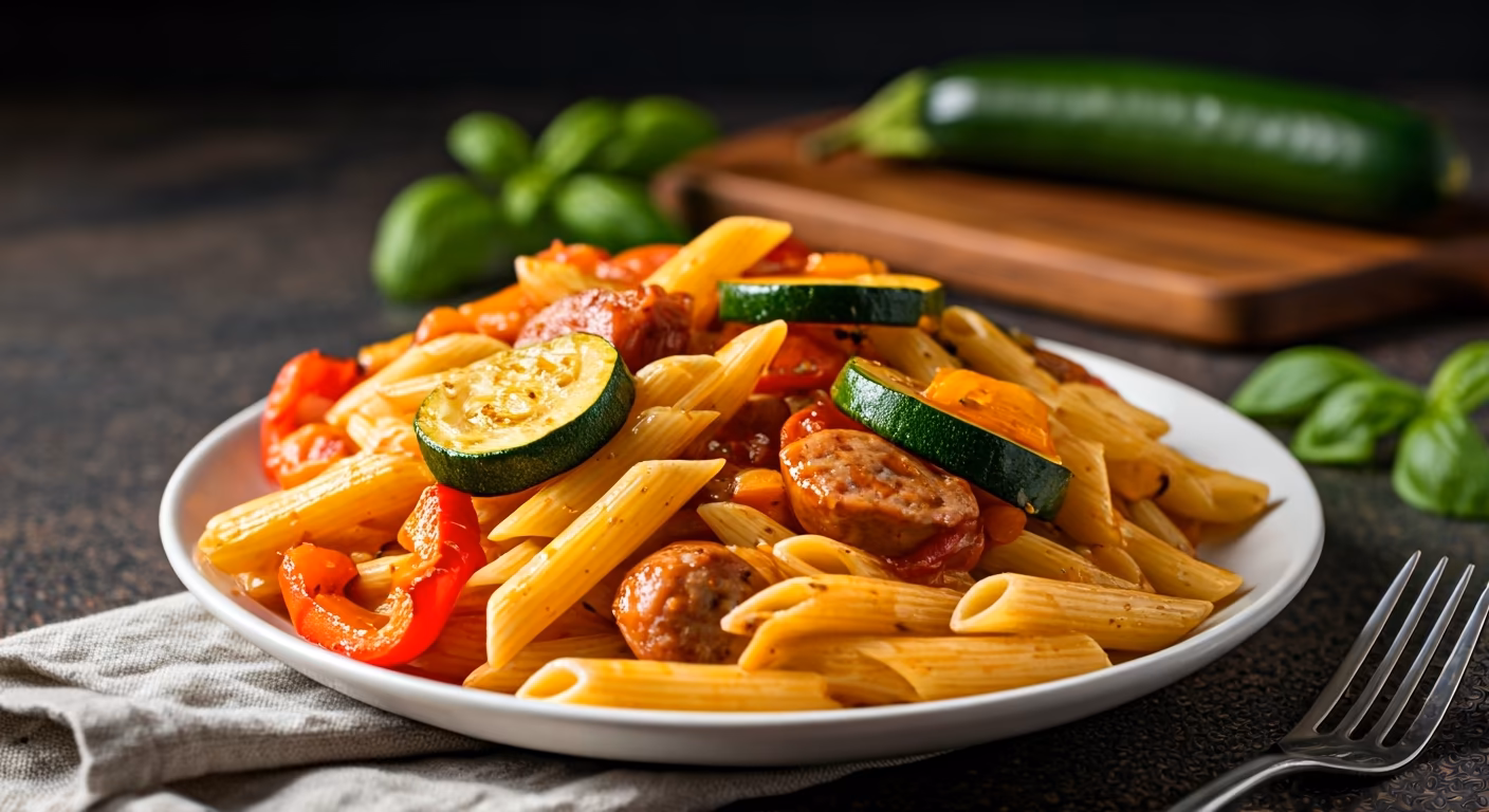 This Roasted Veggie Sausage Pasta is a hearty and flavorful dish that's perfect for a satisfying weeknight meal. Tender pasta is tossed with a medley of roasted vegetables, savory sausage, and a touch of Parmesan cheese. The vegetables are roasted to perfection, bringing out their natural sweetness and creating a delicious caramelization. This dish is a great way to use up any leftover vegetables you have on hand, and it's easily customizable to your liking. It's a complete meal that's both delicious and nutritious.