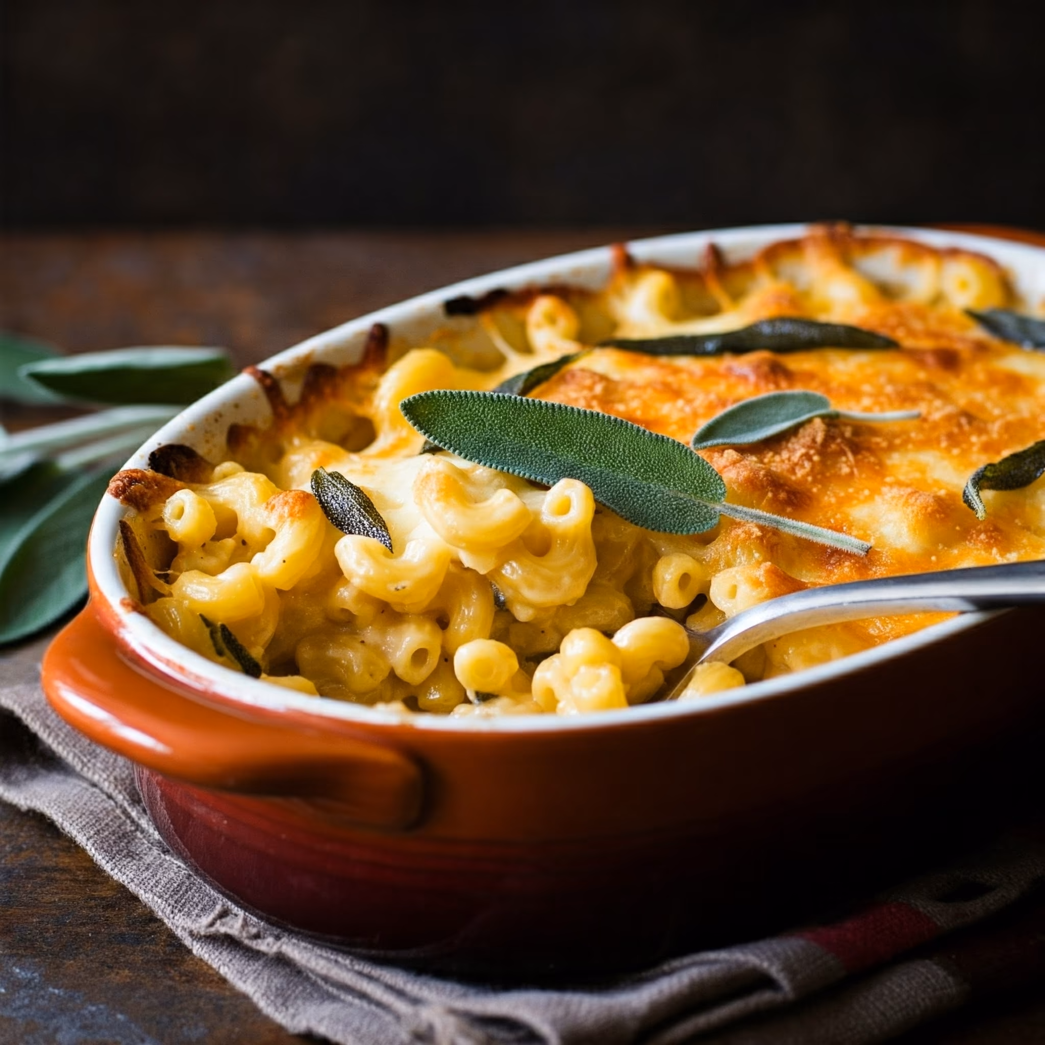 Sage Baked Macaroni and Cheese is a comforting twist on the classic dish, enhanced with the earthy, aromatic flavor of fresh sage. Tender pasta is coated in a rich, creamy cheese sauce made from sharp cheddar, Parmesan, and a hint of Gruyère, creating a luxurious base with layers of flavor. Finely chopped sage is folded into the sauce, adding a warm, herbal note that perfectly complements the cheeses. Topped with a golden, crunchy breadcrumb crust, this baked macaroni and cheese is a hearty, satisfying dish that’s perfect as a main course or a side. Whether served at a holiday feast or a cozy family dinner, it’s a flavorful, crowd-pleasing comfort food.