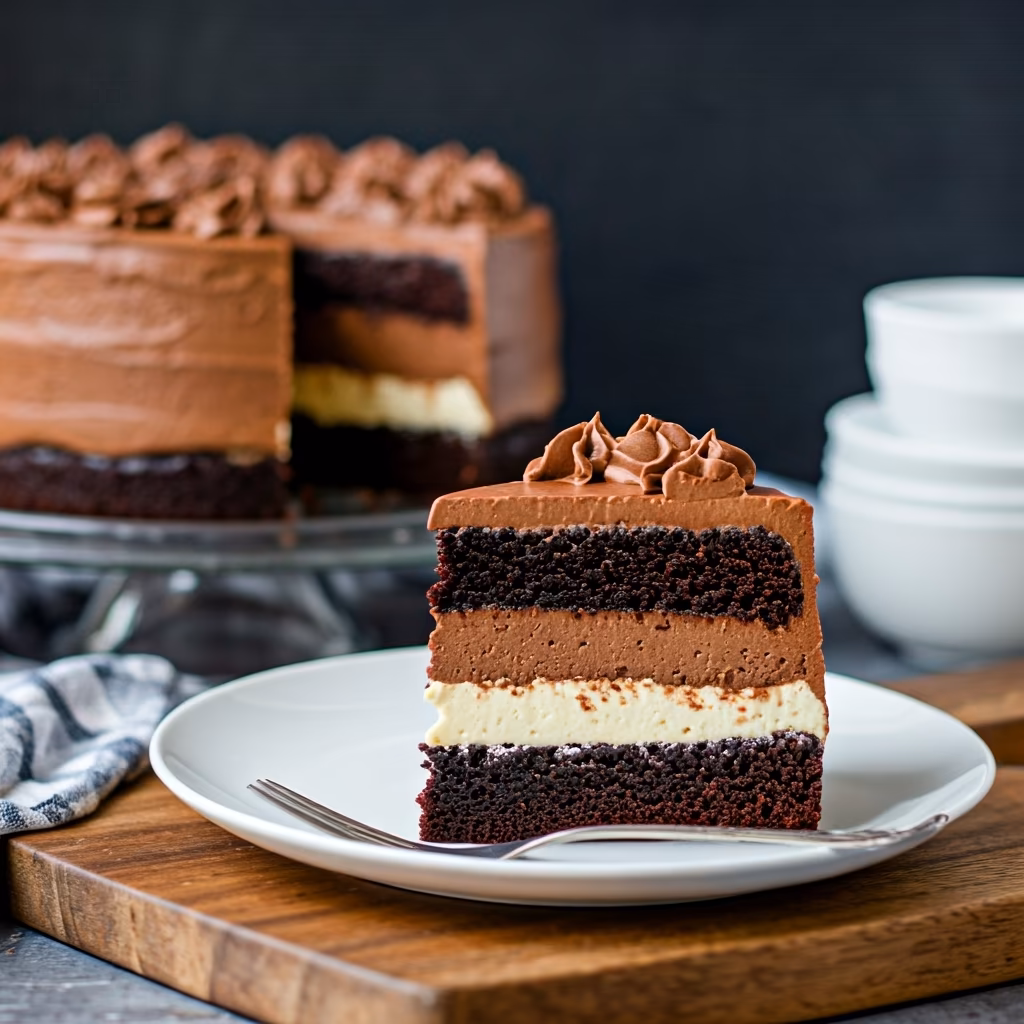 Triple Chocolate Mousse Cake is a decadent dessert that features three layers of chocolate mousse: dark, milk, and white. The cake is typically topped with a chocolate ganache and chocolate shavings.